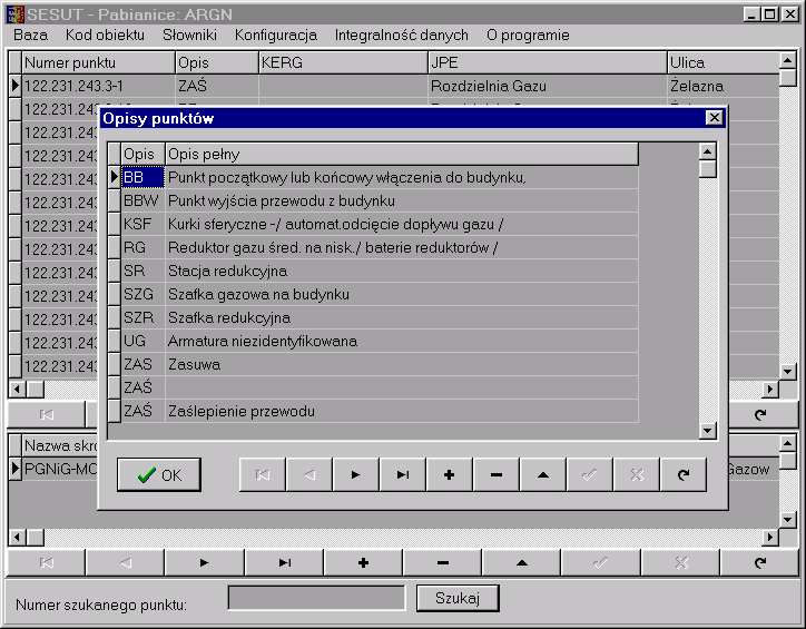 Okno z danymi składa się z dwóch lub trzech list w zależności, czy przeglądane są punkty, czy przewody. W przypadku punktów, oprócz samej listy punktów, wyświetla się także lista właścicieli danego punktu, dla przewodów, oprócz samej listy przewodów, pokazywana jest także lista właścicieli danego przewodu oraz lista odcinków należących do przewodu. Pod każdą listą widoczna jest listwa narzędziowa, służąca do nawigacji oraz do przeprowadzania modyfikacji na określonej liście.